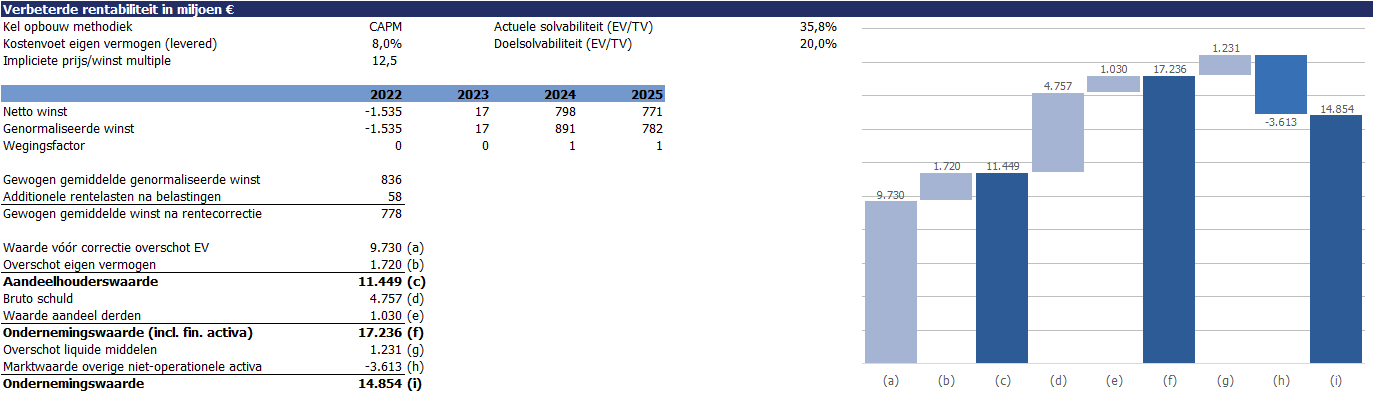 Door de gecorrigeerde gemiddelde winst te delen door de kostenvoet eigen vermogen (Kel), wordt de waarde van het eigen vermogen vóór solvabiliteitscorrectie bepaald. Door hierbij het overschot (tekort) van het eigen vermogen bij op te tellen wordt de waarde van het eigen vermogen bepaald.